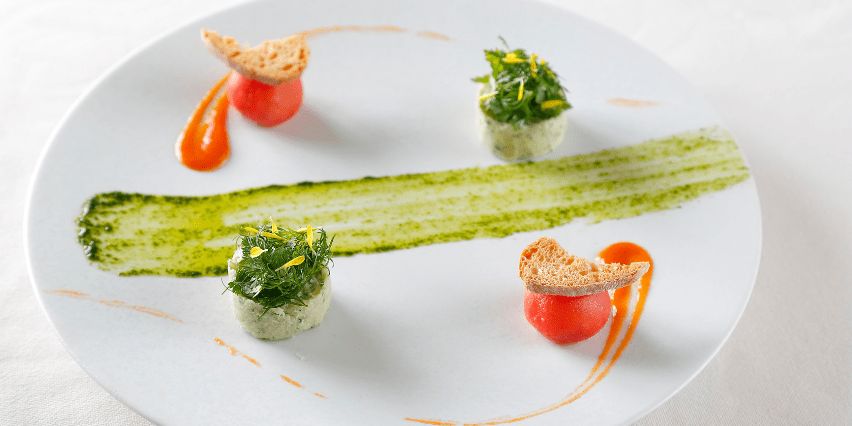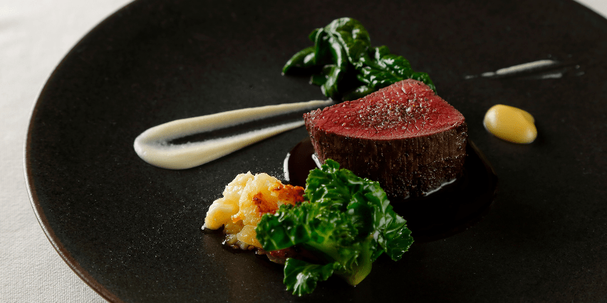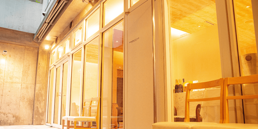「無機質な清潔感」をコンセプトにしたクールな店内。 昼は吹き抜けのテラスに太陽がふりそそぎ、夜は間接照明の温かみが くつろぎを演出する。 そして開放感のある店内に人と料理が鮮やかに彩られて、ゆったりとながれる大人の時間の中、温かいサービスと素材の存在感を大切にした繊細な料理をお楽しみください。